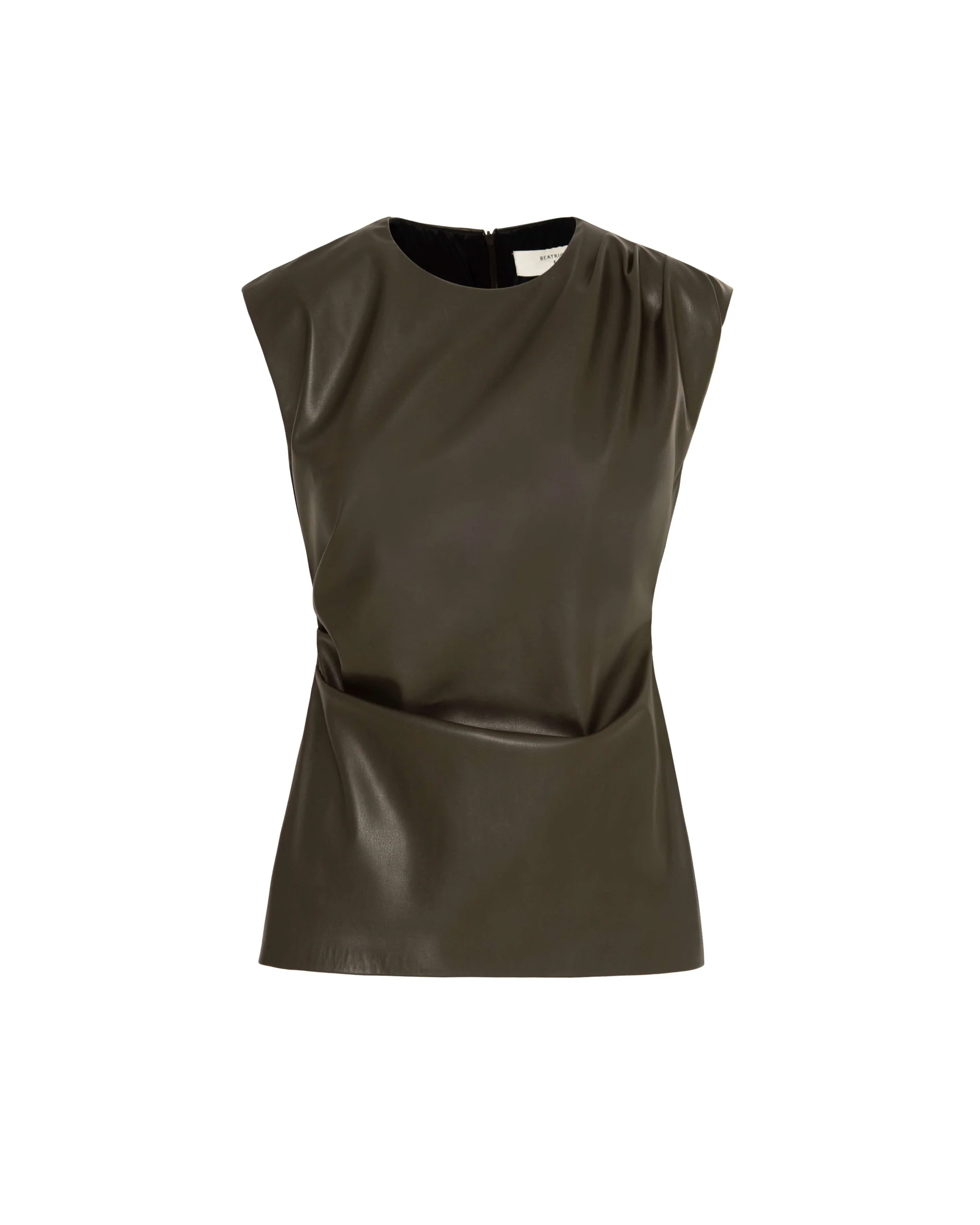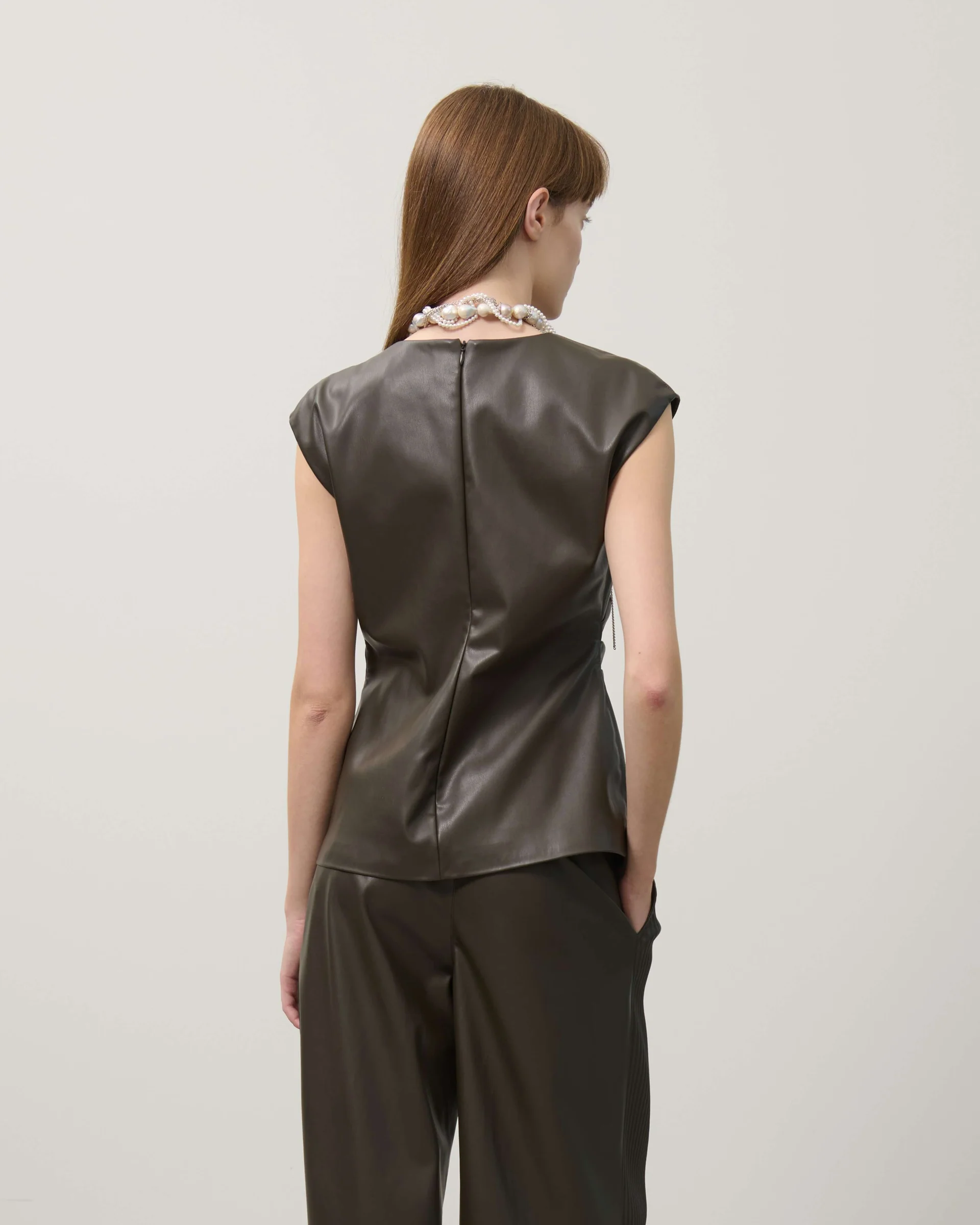 Ιδανικό για συνδυασμό με το ασορτί παντελόνι του, αυτό το τοπ είναι κατασκευασμένο από οικολογικό δέρμα. Διαθέτει μια μινιμαλιστική αλλά θηλυκή σιλουέτα με στρογγυλή λαιμόκοψη, πιέτες στους ώμους και πιέτες στη μέση. Το αόρατο φερμουάρ στο πίσω μέρος ολοκληρώνει το σχέδιο. Κατασκευασμένο στην Ιταλία.