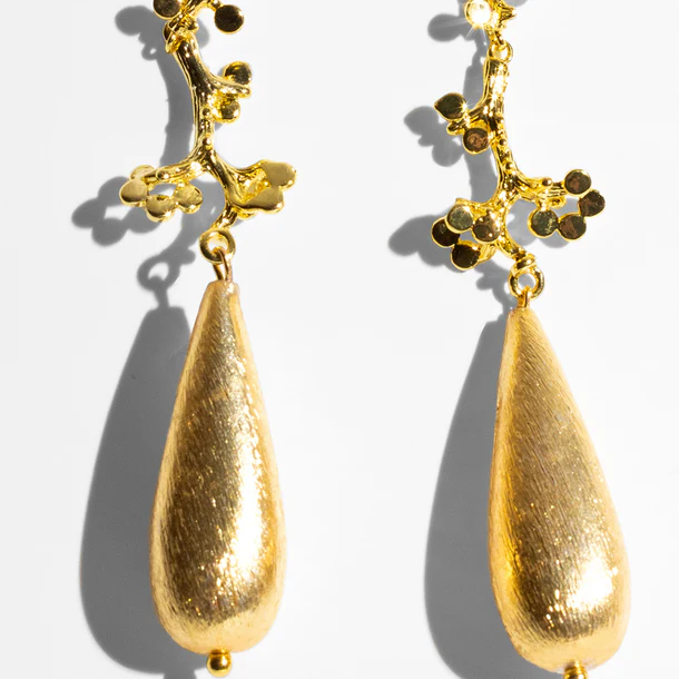 Λαμπερά και τολμηρά, αυτά τα επιχρυσωμένα σκουλαρίκια αποτυπώνουν την κομψότητα ενός σμιλεμένου κλαδιού με άνθη που φέρουν ένα φωτεινό δάκρυ. Ελαφριά αλλά εντυπωσιακά, προσδίδουν μια πινελιά casual γοητείας τόσο στις καθημερινές όσο και στις βραδινές εμφανίσεις.