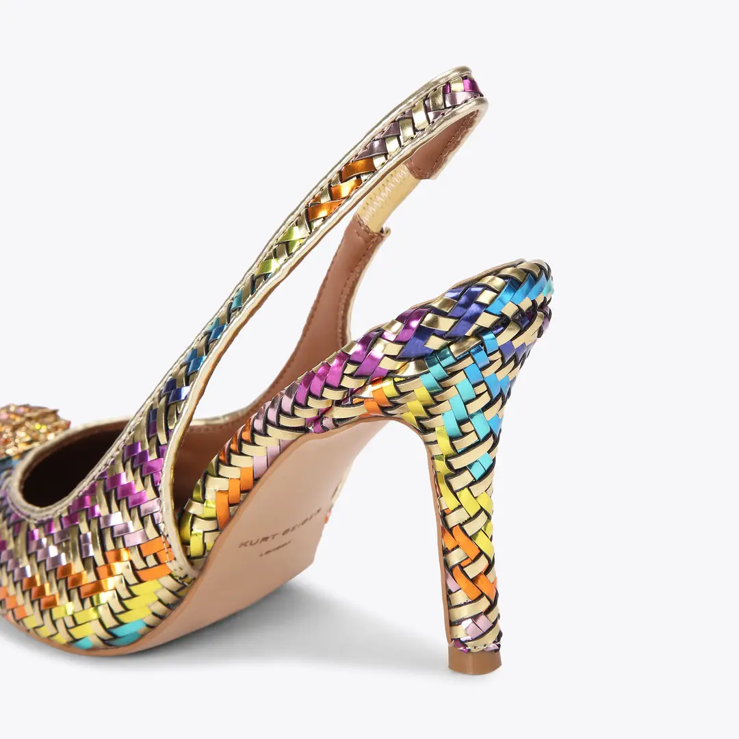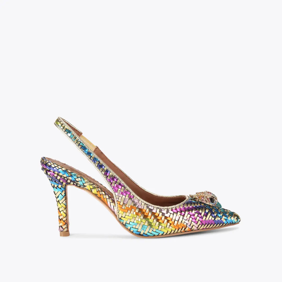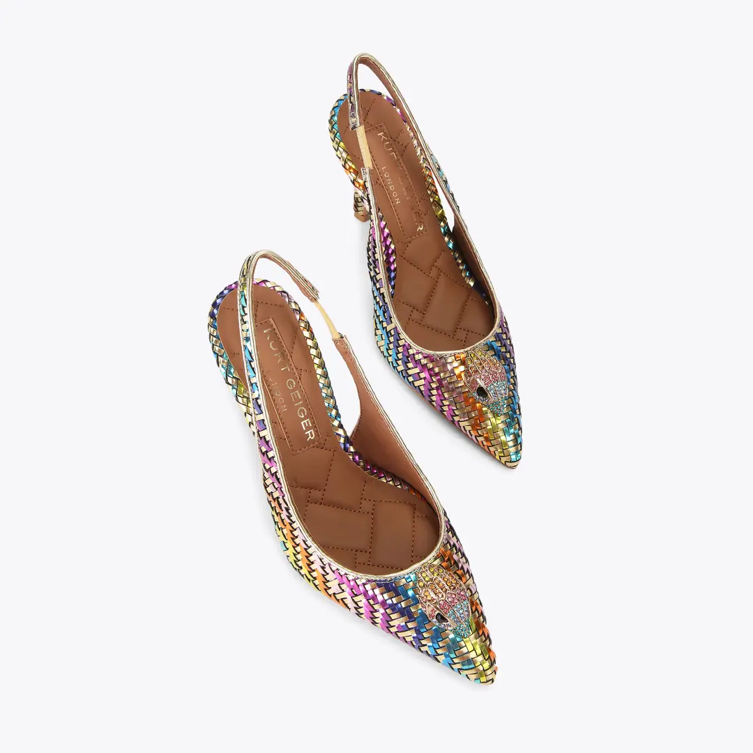 Αυτό το ζευγάρι πολύχρωμες χρυσές γόβες Belgravia είναι σε στυλ slingback με μυτερή μύτη. Υπάρχει ένα χρυσό κεφάλι αετού που κοσμεί τη μύτη του παπουτσιού.