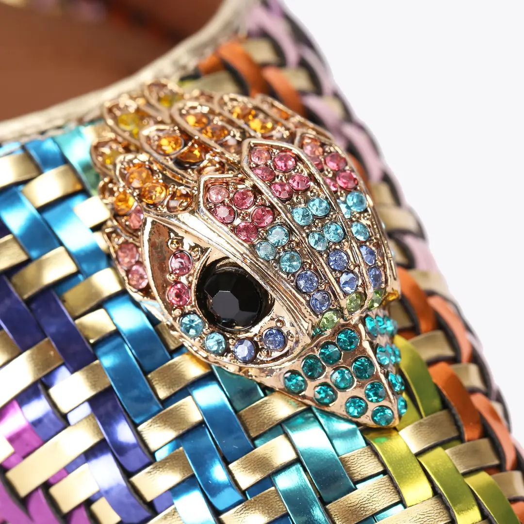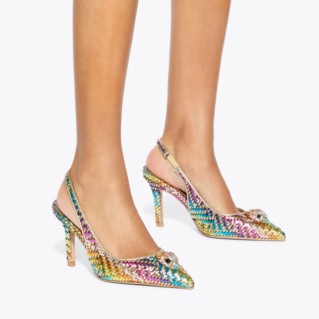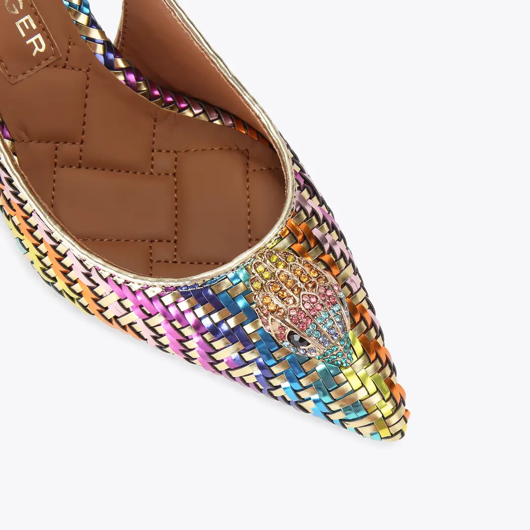 Αυτό το ζευγάρι πολύχρωμες χρυσές γόβες Belgravia είναι σε στυλ slingback με μυτερή μύτη. Υπάρχει ένα χρυσό κεφάλι αετού που κοσμεί τη μύτη του παπουτσιού.