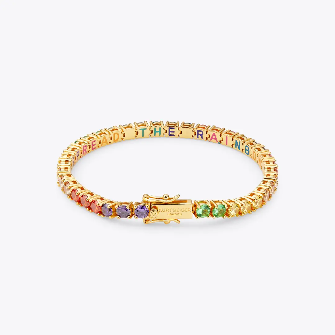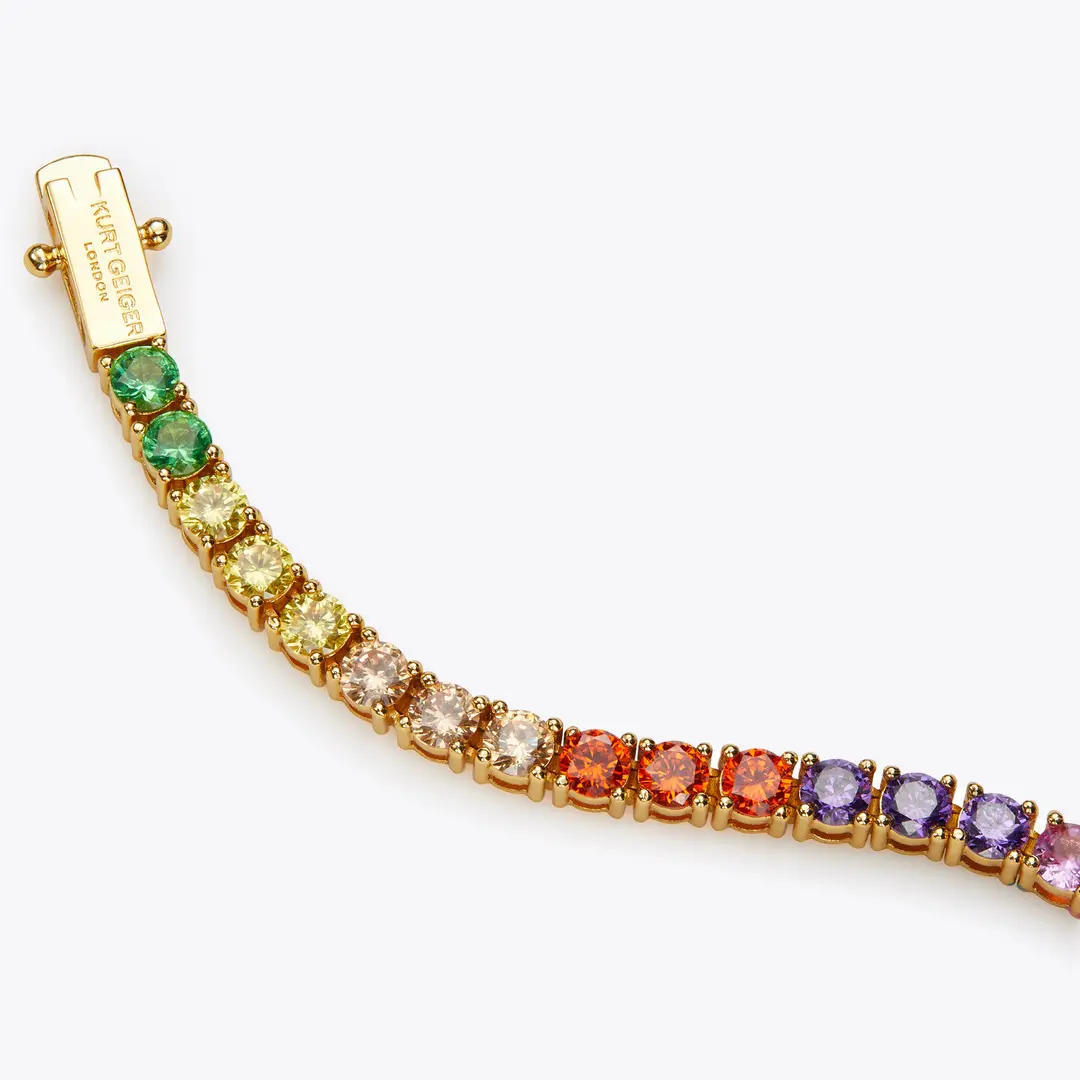 Αυτό το χρυσό βραχιόλι τένις διαθέτει πολύχρωμους πολύτιμους λίθους για μια συναρπαστική ποπ των χρωμάτων. Στο εσωτερικό είναι χαραγμένο το σλόγκαν «Spread The Rainbow», ενώ το ανοιχτό κούμπωμα του κουτιού είναι σε χρυσό για άπειρη εμφάνιση.