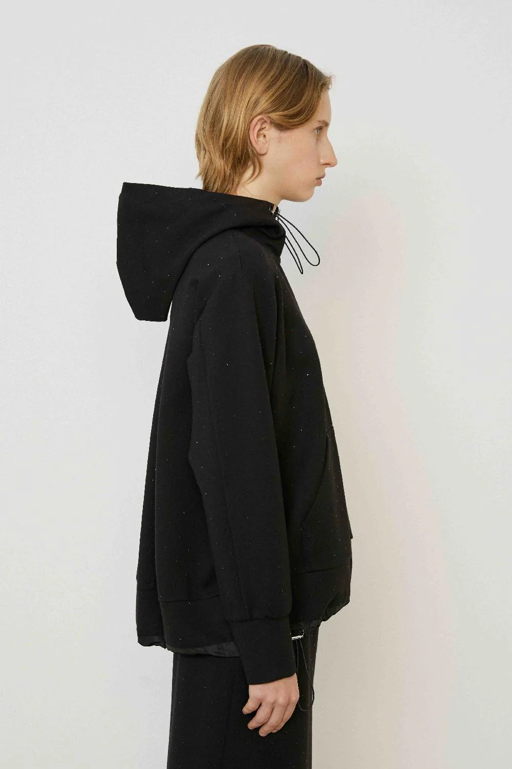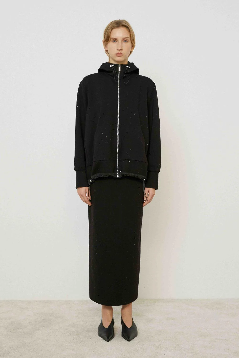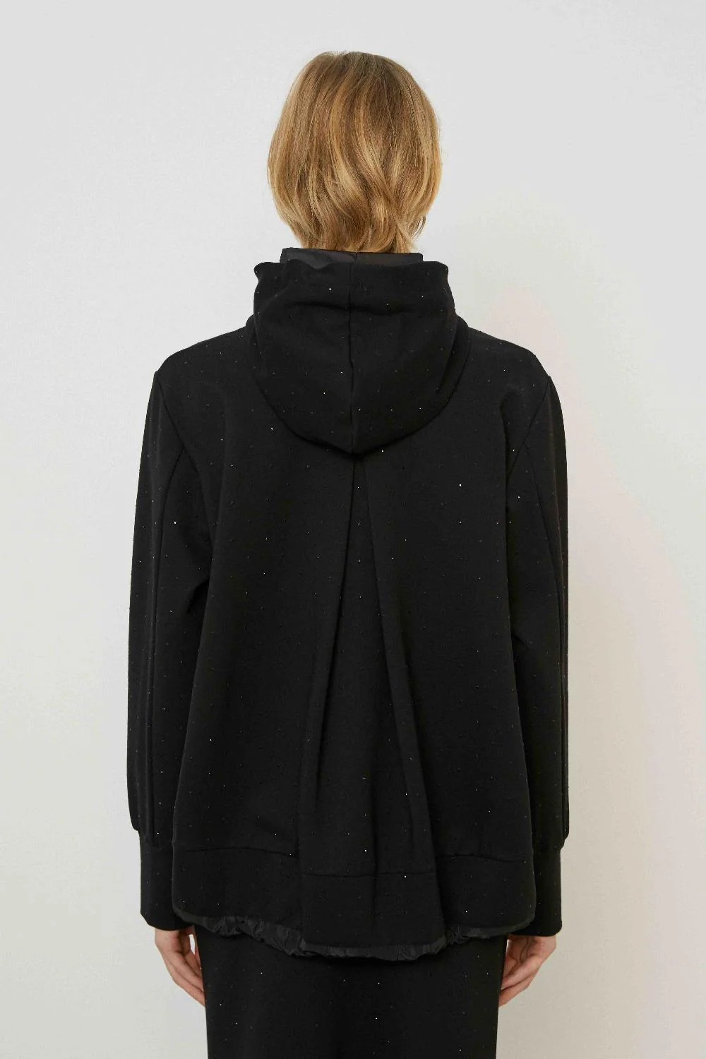 Μακρυμάνικο φούτερ με κουκούλα επενδυμένη με ταφτά και απλικαρισμένα στρας. Κλεισιμο με φερμουάρ μπροστά, κουκούλα και κορδόνι που σφίγγει στο κατω μέρος.
