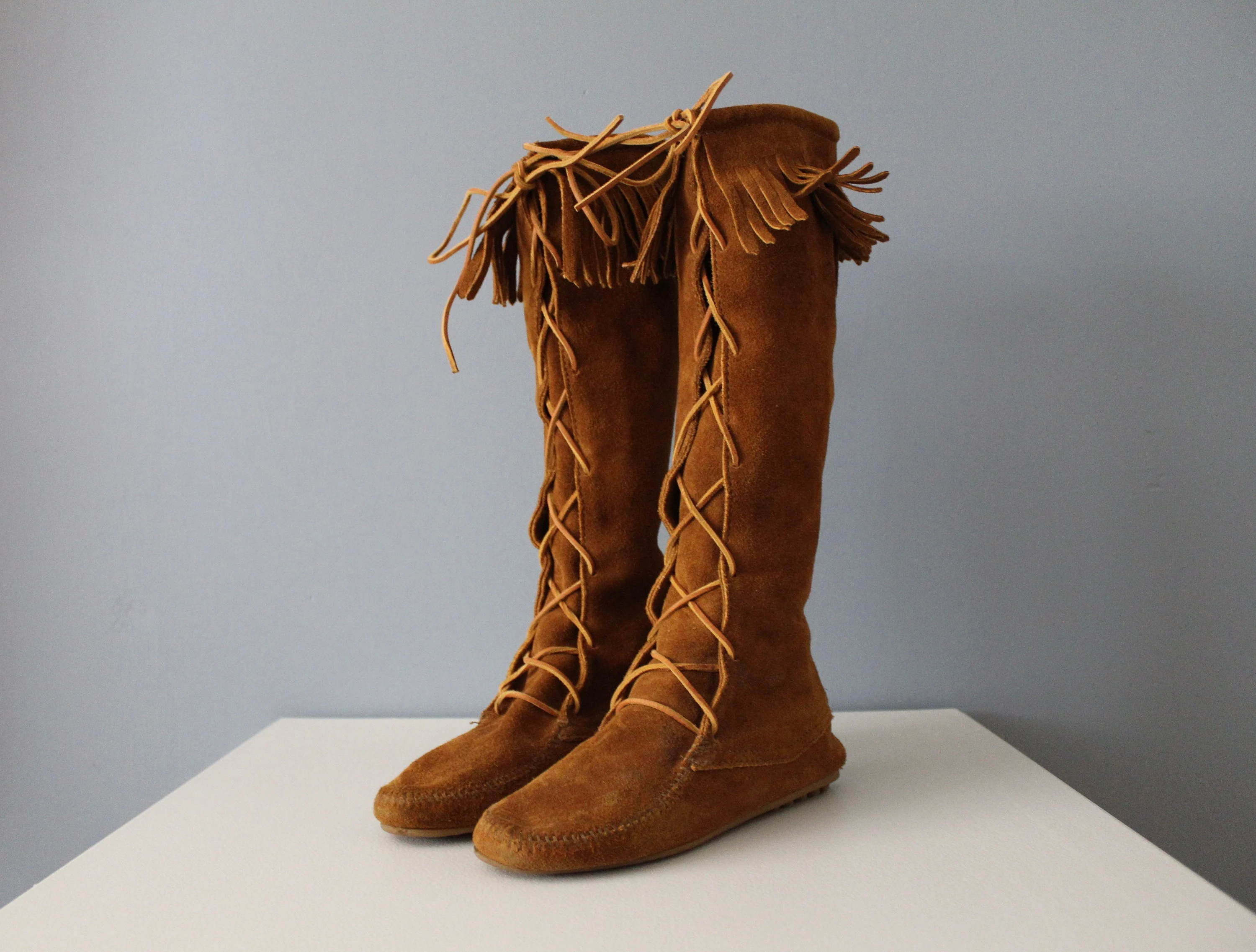 Ξεχωρίστε στο επόμενο φεστιβάλ με αυτές τις εμβληματικές μπότες με κορδόνια. Μια μόδα απαραίτητη για διασημότητες και trendsetters, αυτές οι boho-chic μπότες μοκασίνι με κορδόνια μέχρι ακριβώς κάτω από το γόνατο. Φτιαγμένο στο χέρι σήμερα από το ίδιο κομψό σχέδιο που παρουσιάστηκε το 1968. Τα μακριά κορδόνια από ακατέργαστο δέρμα επιμηκύνουν την εμφάνισή σας ενώ το απλό περιθώριο χορεύει από τις μπότες σε κάθε βήμα. Υλικά Μαλακό δέρμα σουέτ Εσωτερική σόλα με επένδυση Ελαφριά σπορ σόλα από καουτσούκ Ρυθμιζόμενη δαντέλα από ακατέργαστο δέρμα Κόλλα True to Size Ύψος: 16,5 ίντσες Περιφέρεια γάμπας: 15 ίντσες