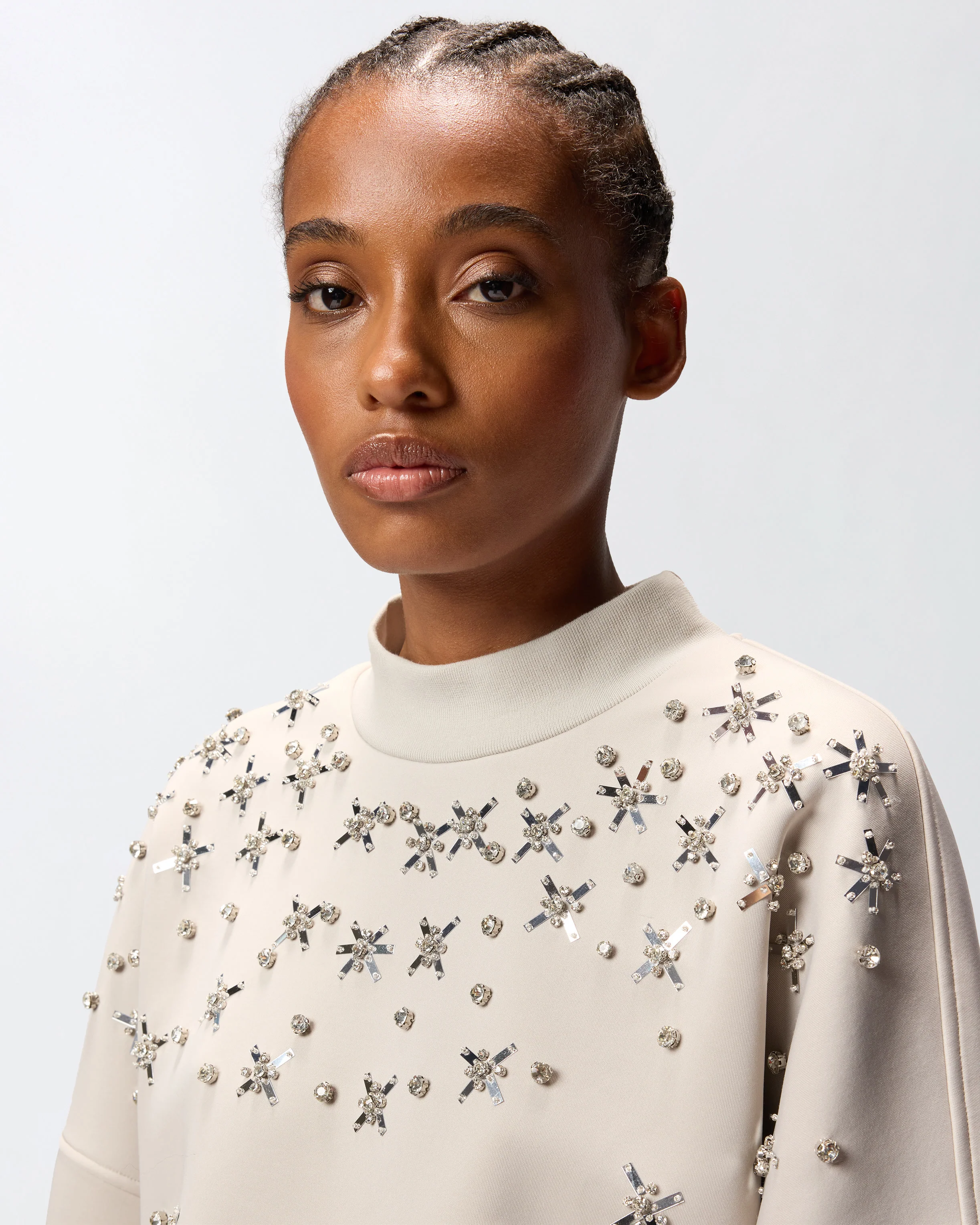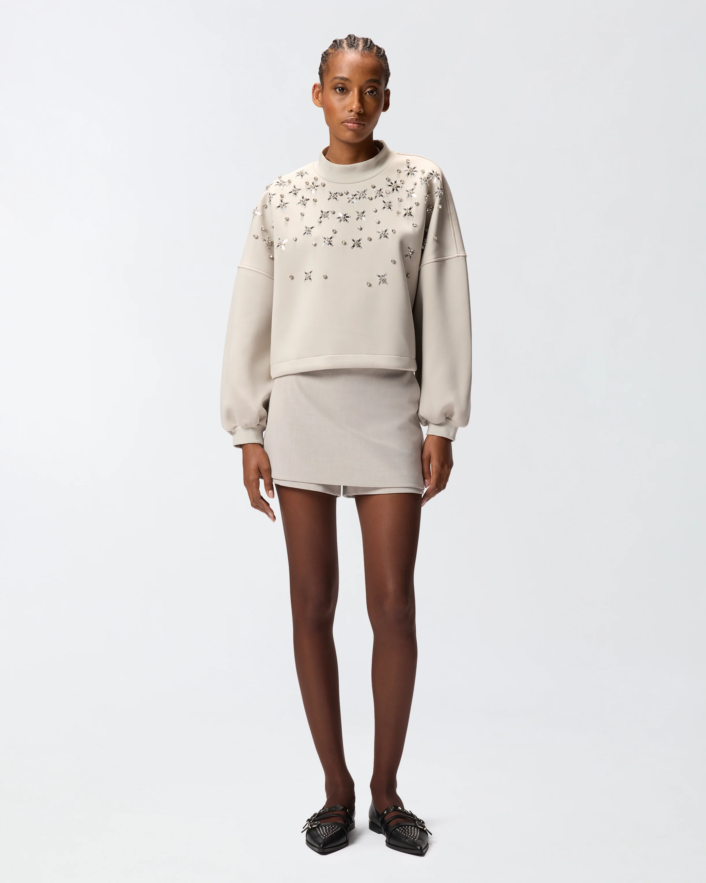 Μπλούζα με στρόγγυλη λαιμόκοψη και μακριά φουσκωτά μανίκια, με χαλαρή εφαρμογή, από τεχνικό νεοπρέν ύφασμα. Οι πεσμένοι ώμοι και το ελαφρώς oversize στυλ με σπορ ύφος δημιουργούν μια πρωτότυπη αντίθεση με το λαμπερό κέντημα από κρύσταλλα και πούλιες στο μπροστινό τμήμα, που σχηματίζουν αστέρια. Αυτό το πρωτότυπο μοντέλο θα φωτίσει αναμφισβήτητα τα πρωινά και τα outfits σας.