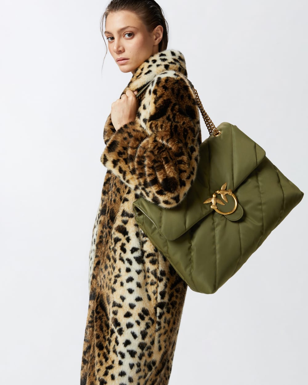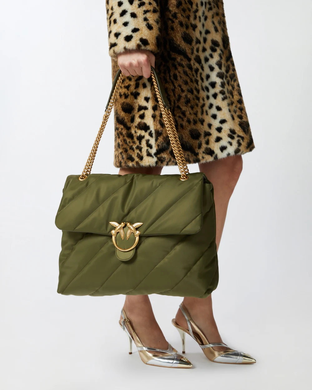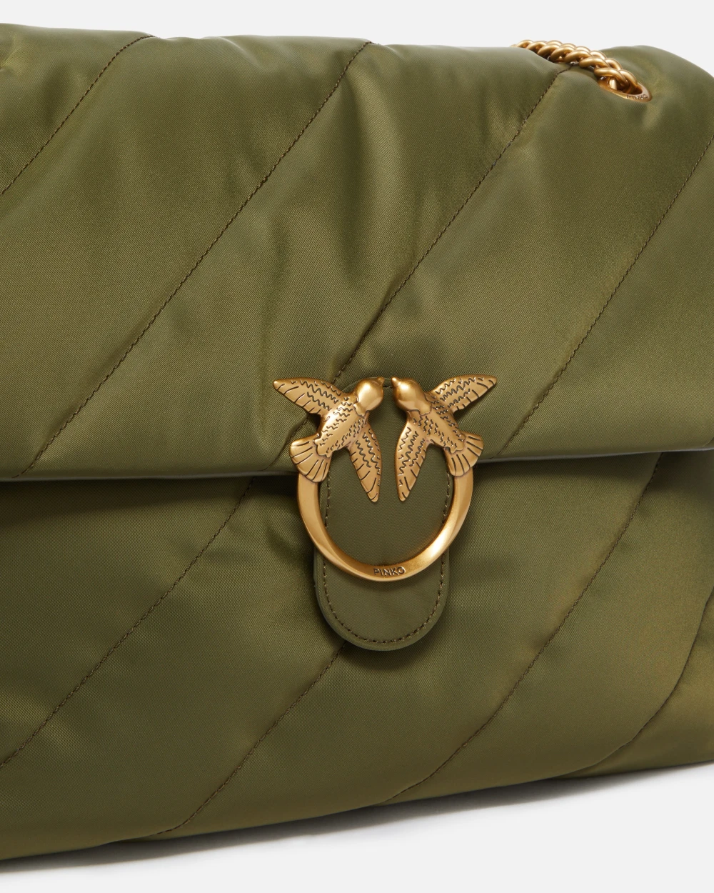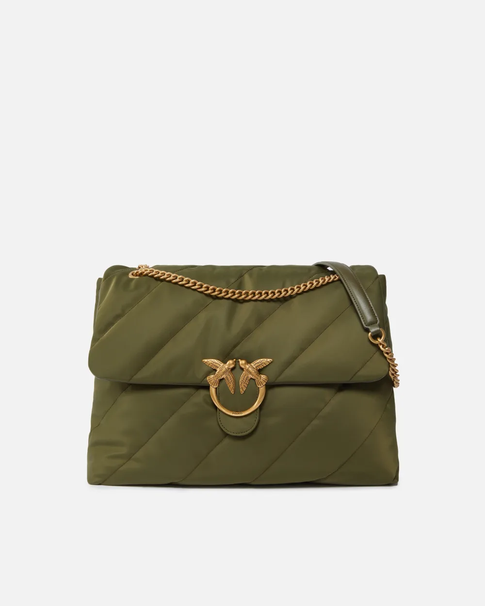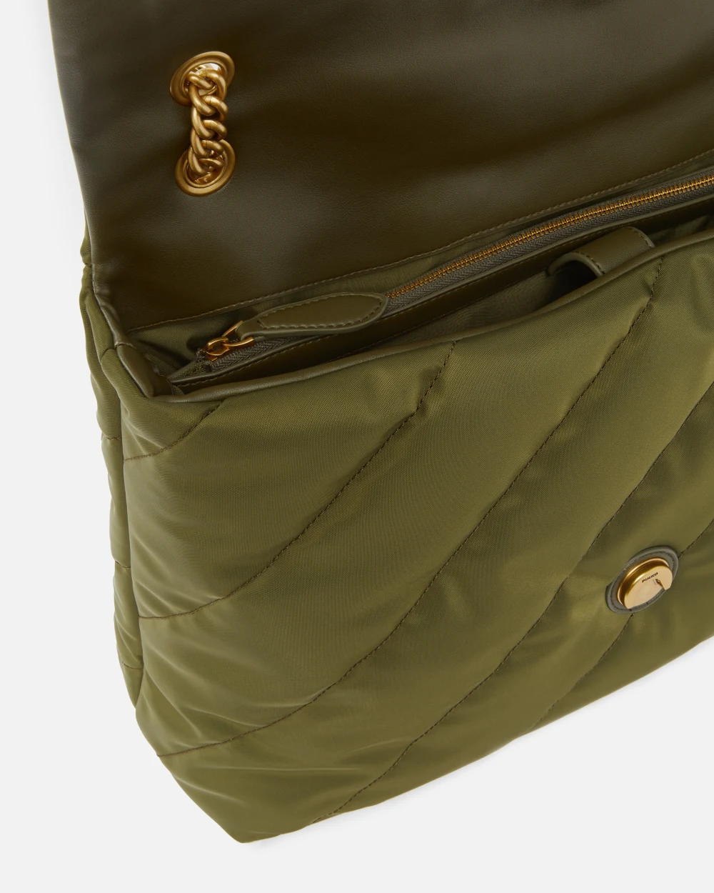 Μεγάλη Extra Love Bag Puff από ύφασμα από ανακυκλωμένες ίνες με διαγώνιο μάξι καπιτονέ και ιμάντα ώμου. Κλείσιμο με πτερύγιο συνοδευόμενο από αντίκα επιχρυσωμένη αγκράφα Love Birds Diamond Cut. Εσωτερικά, έχει επένδυση από ανακυκλωμένο πολυβαμβάκι και εύχρηστη τσέπη με φερμουάρ. Ο μεταλλικός ιμάντας αλυσίδας με πρακτικό μαξιλαράκι ώμου από το ίδιο ύφασμα με την τσάντα σας επιτρέπει να το φοράτε χιαστί ή στον ώμο, όπως χρειάζεται. Ενεργοποιήστε την PINKO τσάντα σας: επαληθεύστε τη γνησιότητα του προϊόντος σας και αποκτήστε πρόσβαση σε μια εξατομικευμένη εμπειρία σαρώνοντας το κέντημα Love Birds στο πίσω μέρος της τσάντας με το smartphone σας!