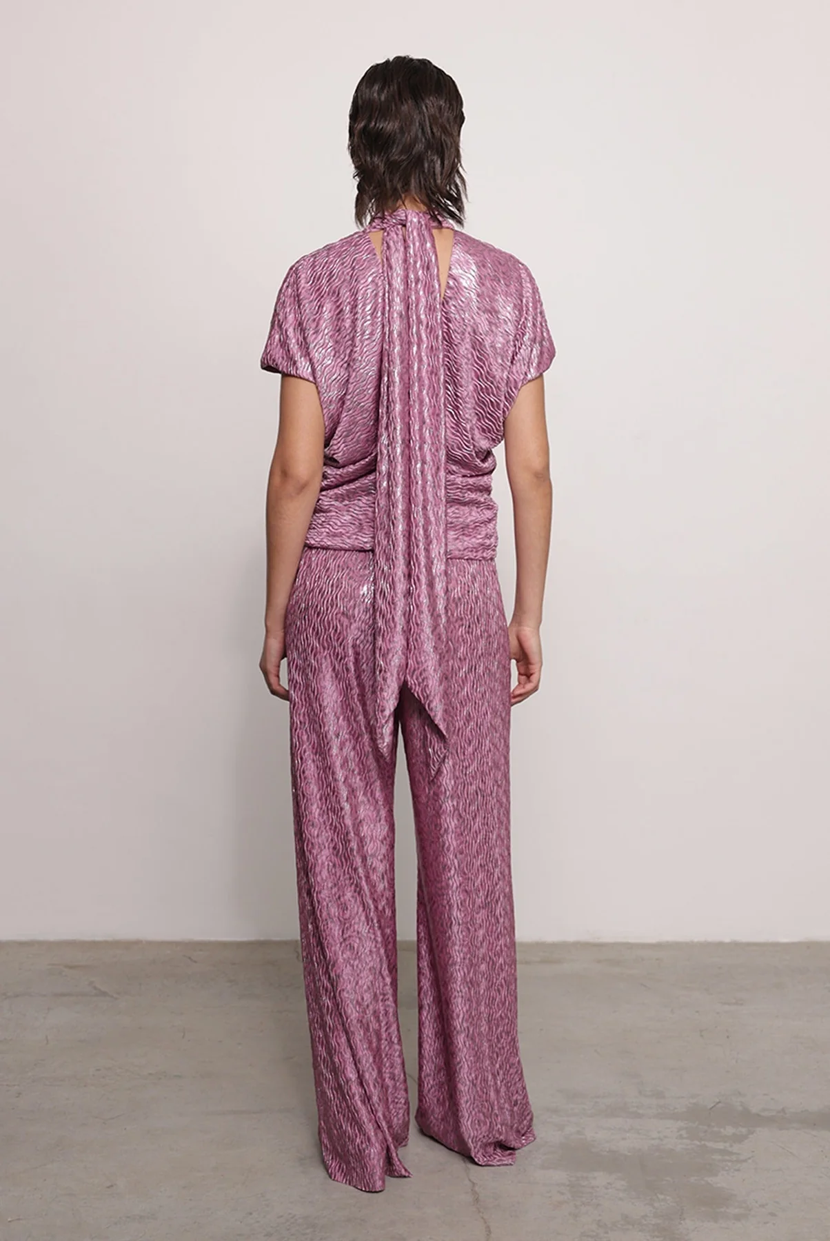 - Βραδινό πλισέ πλεκτό παντελόνι με foil από την Sabina Musayev.