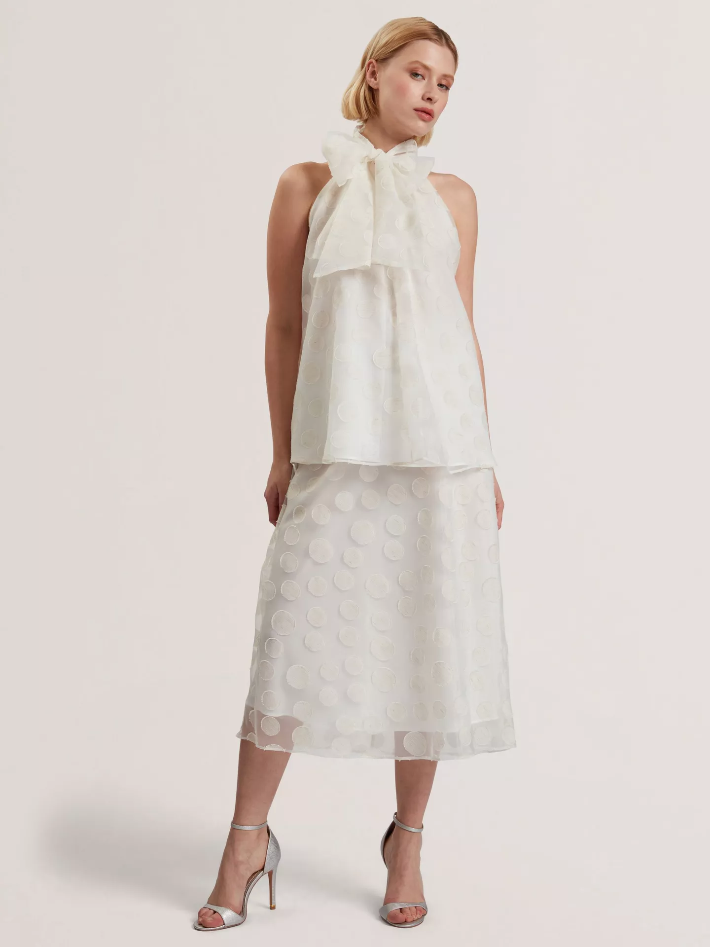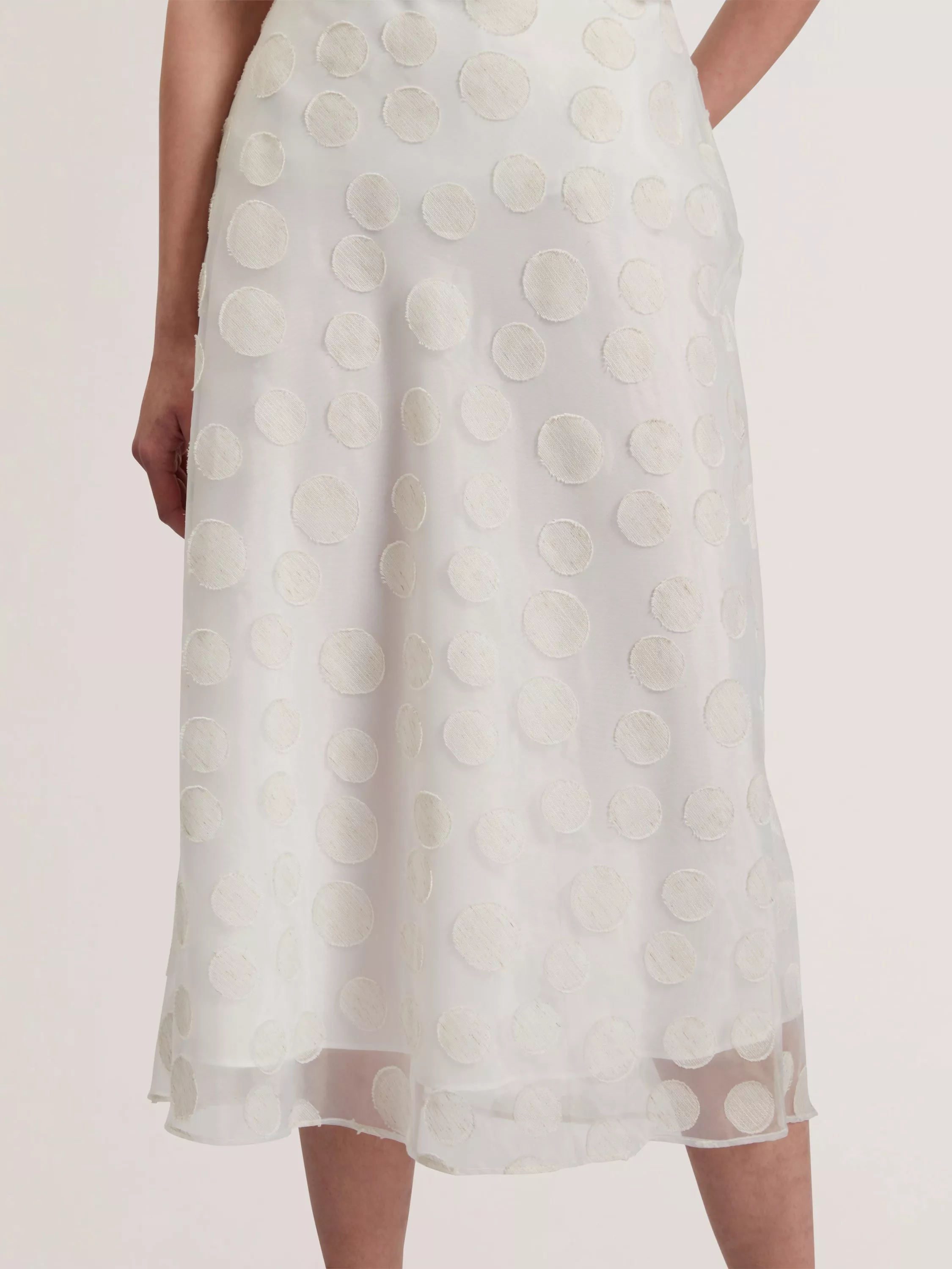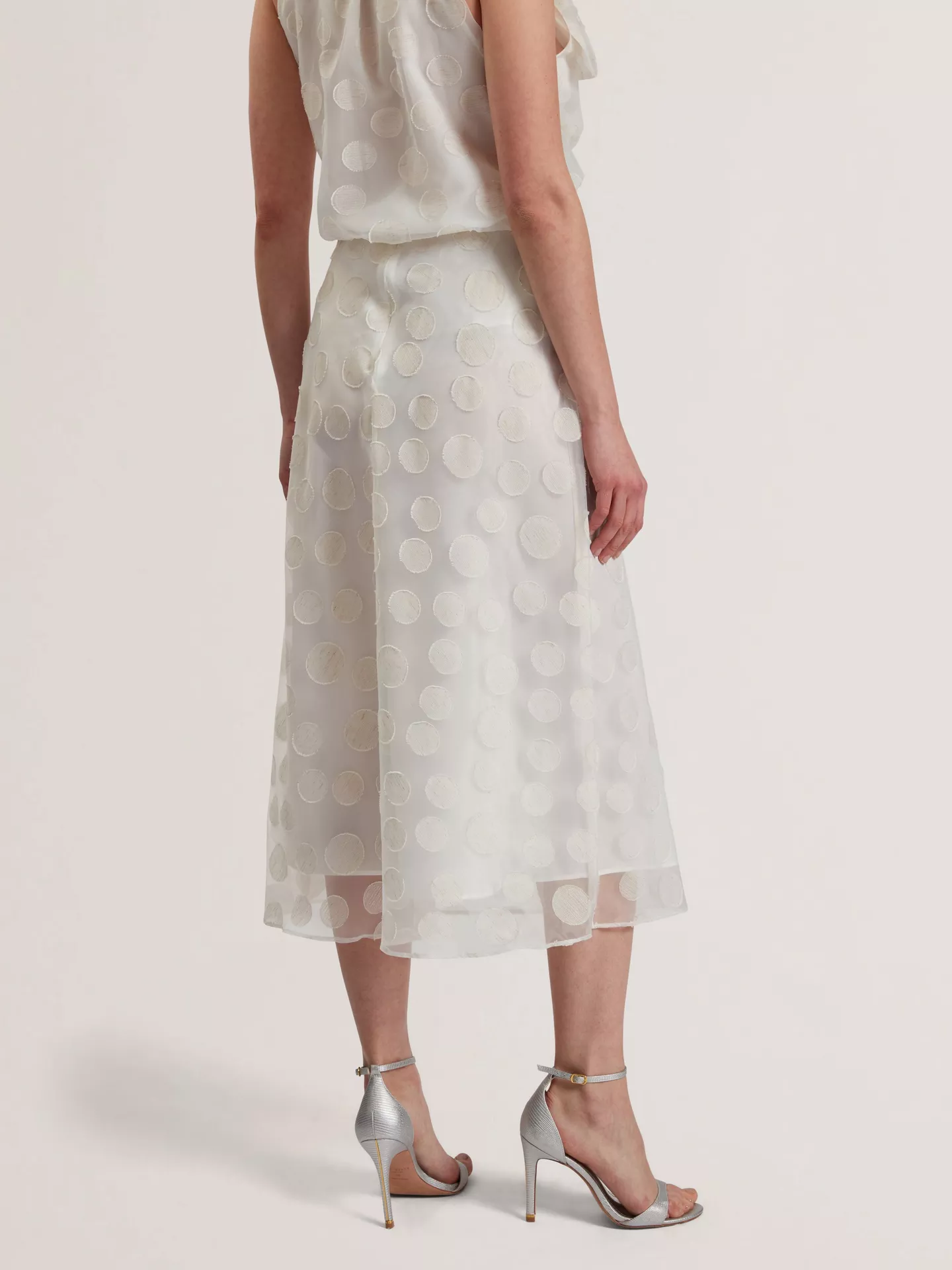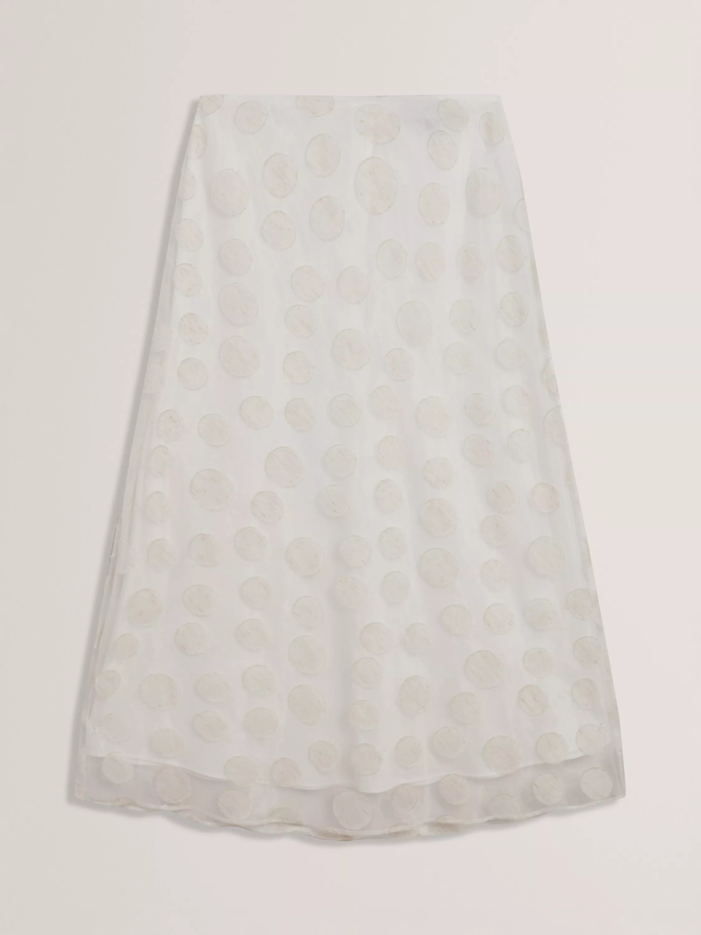 Σε γραμμή Α, αυτή η μίντι φούστα από την Ted Baker κάθεται φυσικά στη μέση και είναι διακοσμημένη με άσπρα πουά στην ύφανση.